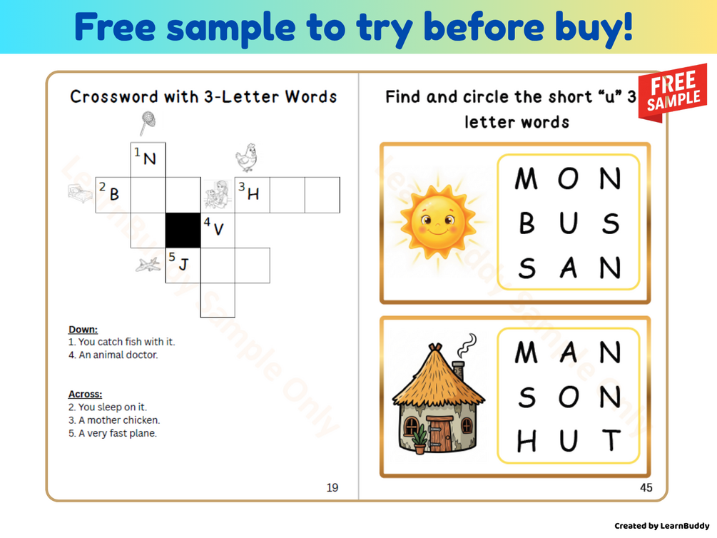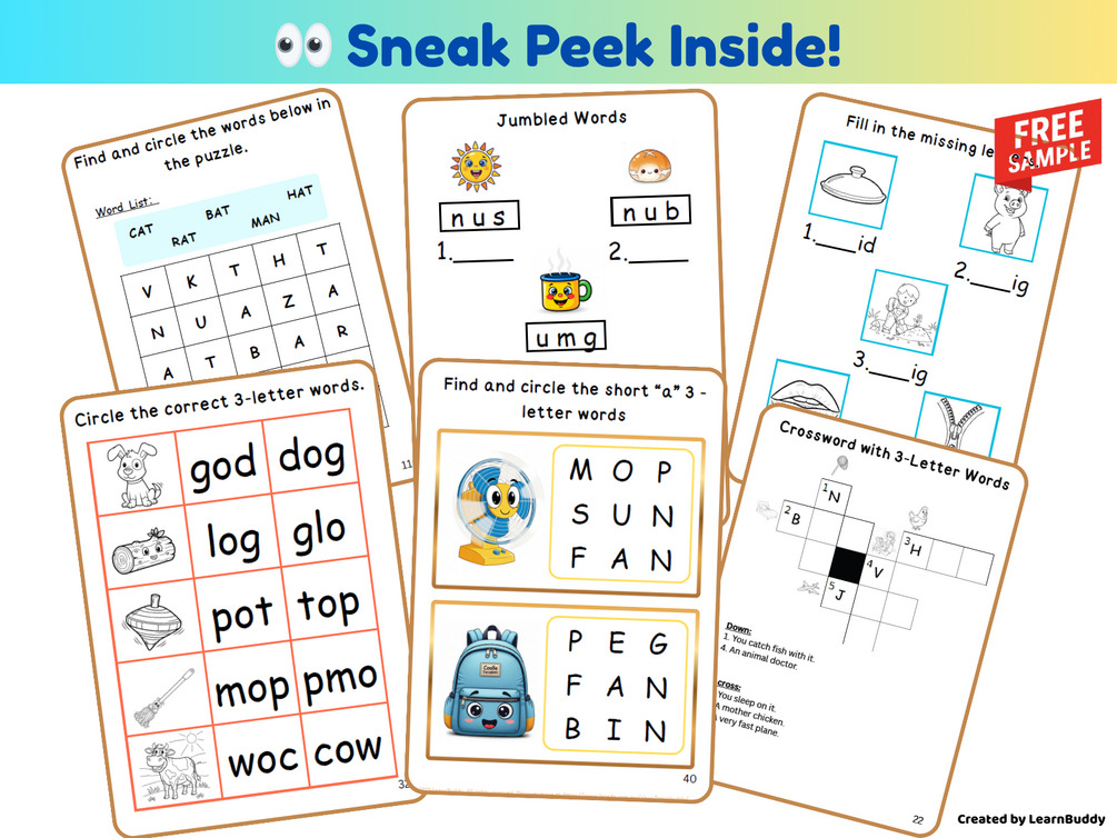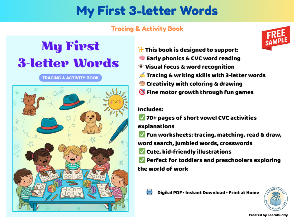 Help your child master simple 3-letter words with this fun and interactive FREE 3-page sample from our full My First CVC Words Activity Workbook! Packed with tracing, coloring, matching, word search, scrambled word puzzles, and more — perfect for preschoolers and early readers.