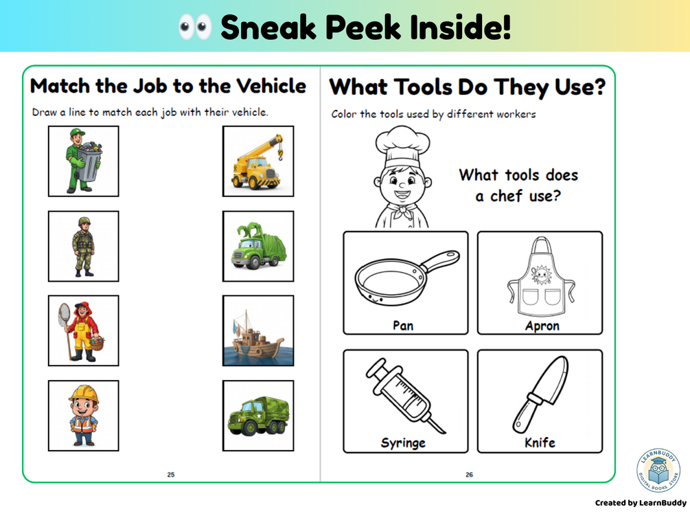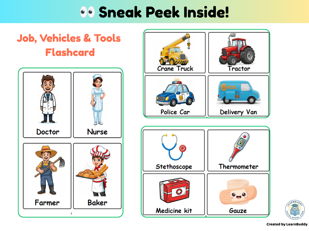 ✔ Flashcards with clear visuals – jobs, vehicles, and tools made simple for kids