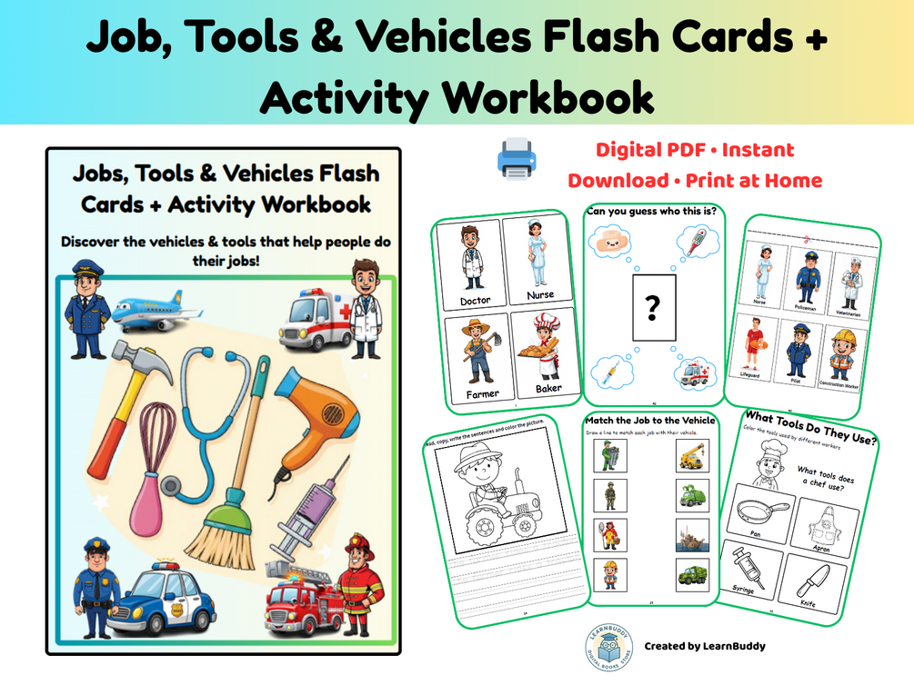 Help your child explore how community jobs connect with the vehicles they drive and the tools they use in this fun and educational printable pack! Specially designed for toddlers and preschoolers, this PDF bundle includes engaging flashcards and hands-on activities like tracing, matching, coloring, and cutting — making learning about jobs, vehicles, and tools exciting and meaningful.