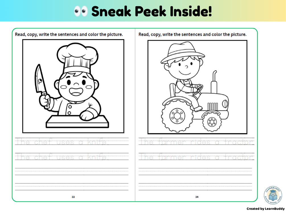✔ Traceable sentences (e.g., “A firefighter uses a hose.”) to build early writing skills