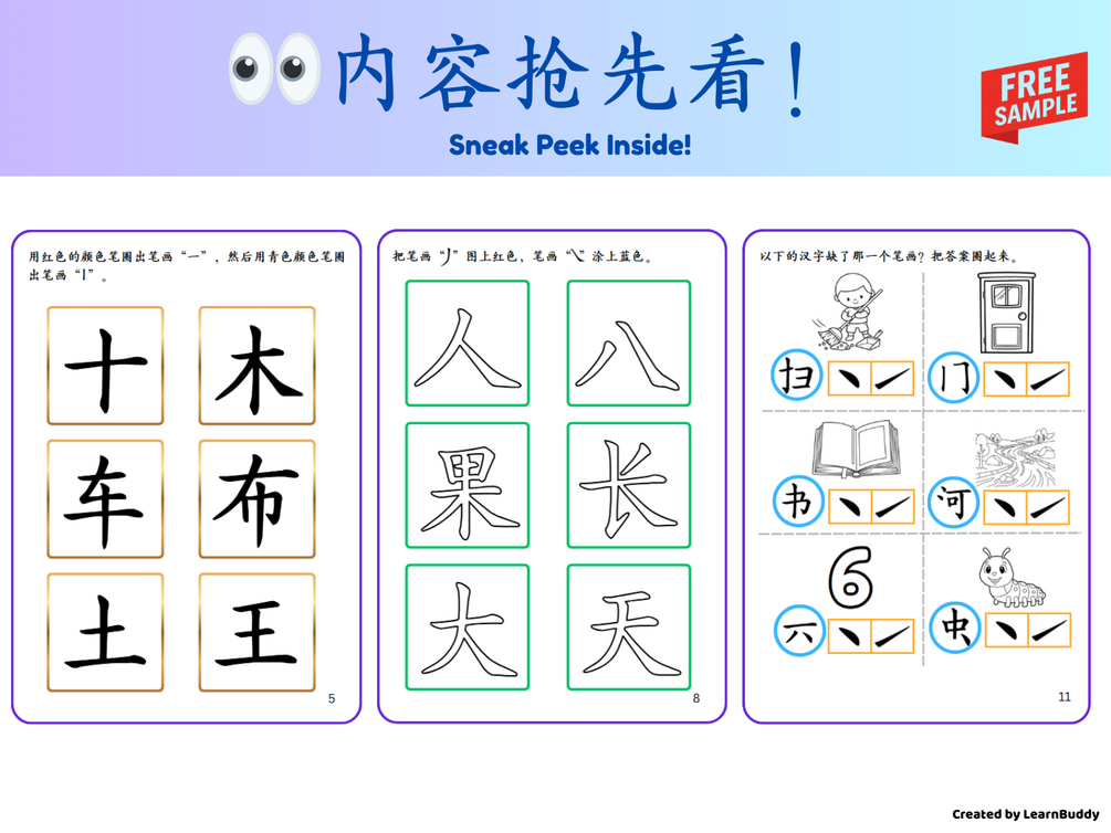 Help your child start learning Chinese handwriting with this fun and interactive FREE 3-page sample from our full My First Chinese Strokes Practice Book!