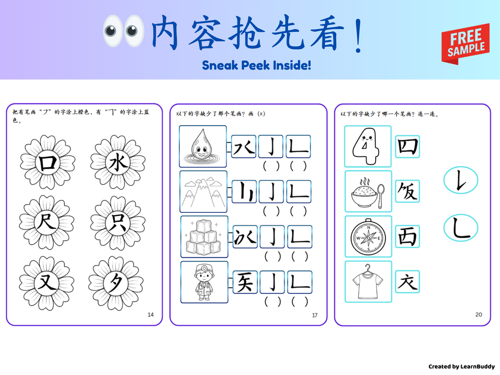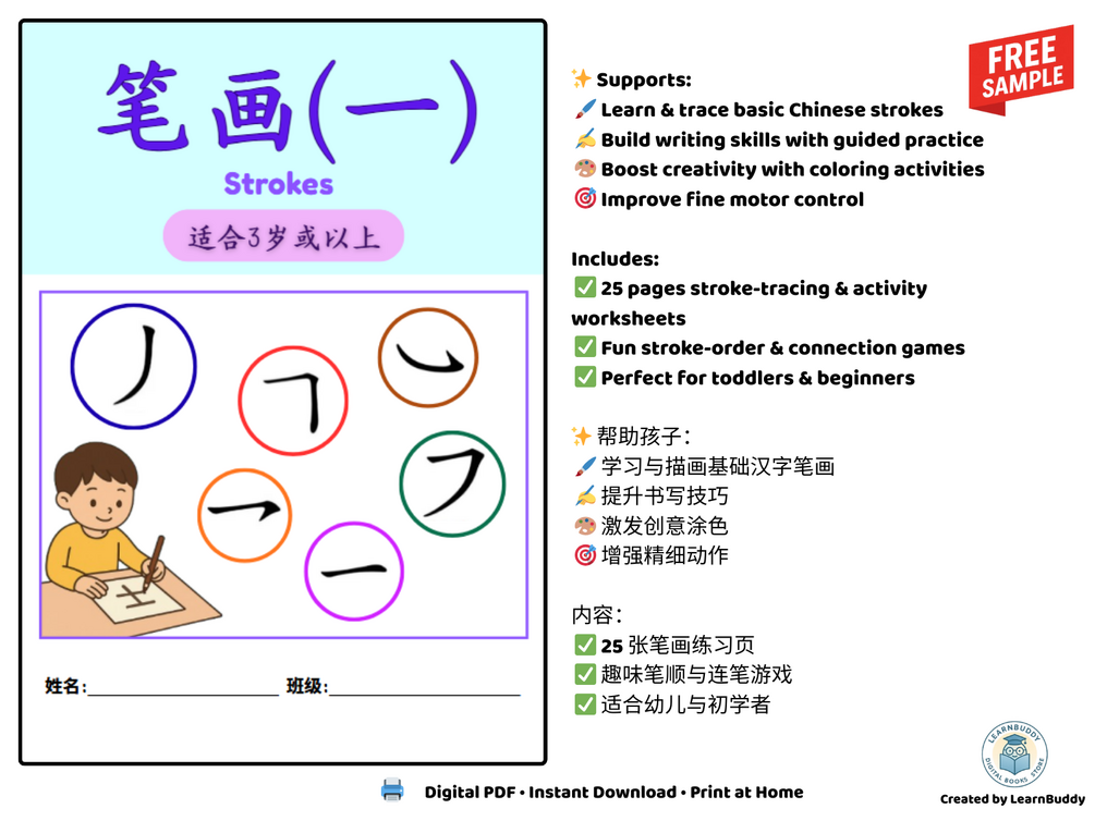 Help your child start learning Chinese handwriting with this fun and interactive FREE 3-page sample from our full My First Chinese Strokes Practice Book! Packed with tracing, coloring, and simple matching activities — perfect for preschoolers and early learners.