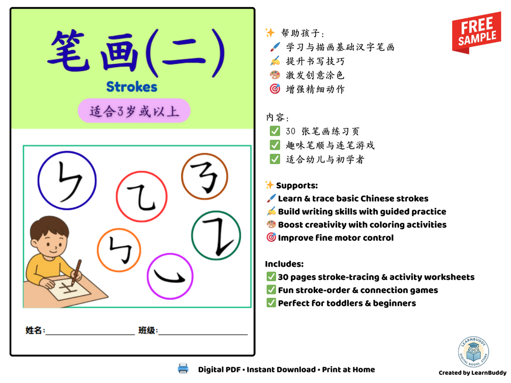 Help your child start learning Chinese handwriting with this fun and interactive FREE 3-page sample from our full My First Chinese Strokes Practice Book! Packed with tracing, coloring, and simple matching activities — perfect for preschoolers and early learners.