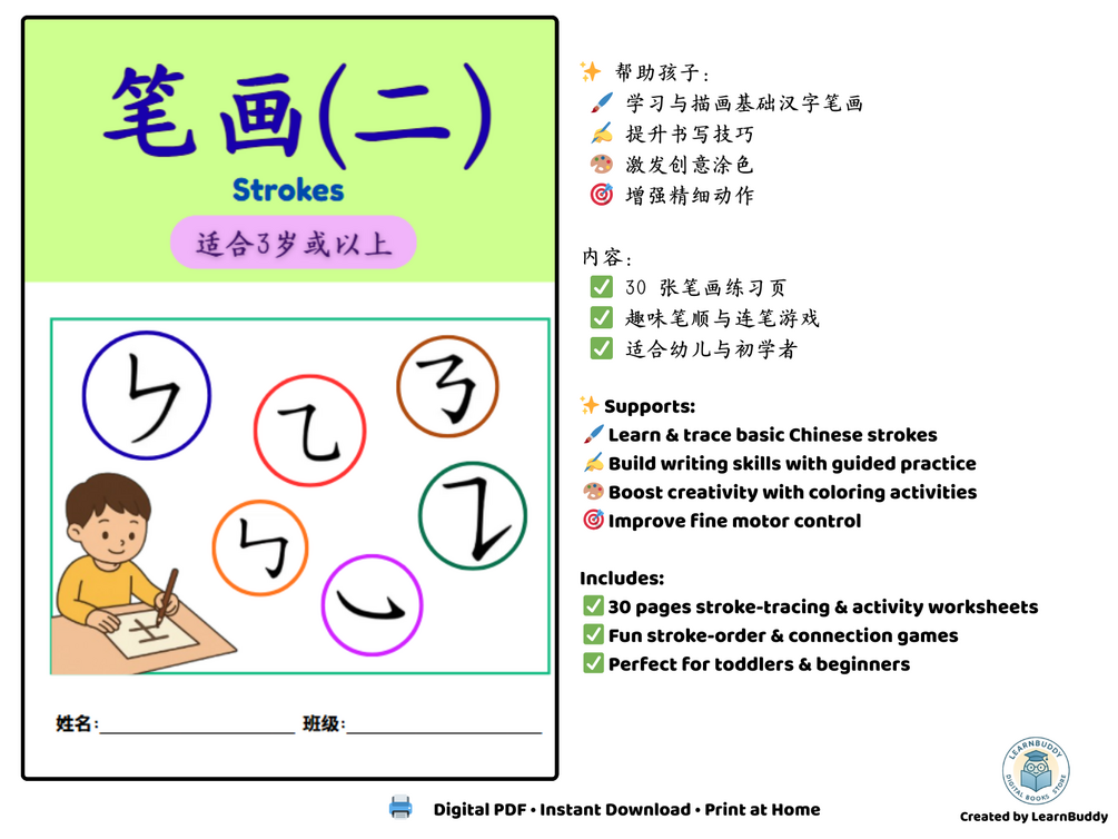 Help your child build a strong Chinese handwriting foundation with this fun and educational Basic Stroke Practice Book! Specially designed for preschoolers and early learners, this printable PDF is filled with engaging activities that make learning Chinese strokes easy and enjoyable — through tracing, coloring, and simple matching games.