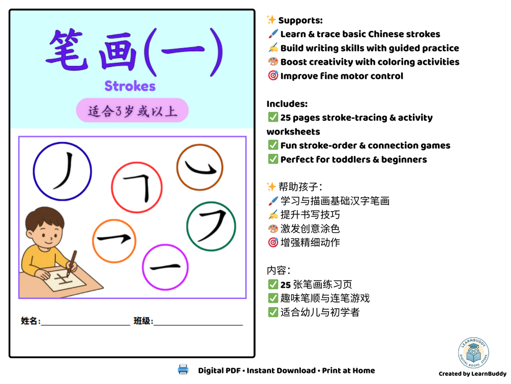 Help your child build a strong Chinese handwriting foundation with this fun and educational Basic Stroke Practice Book! Specially designed for preschoolers and early learners, this printable PDF is filled with engaging activities that make learning Chinese strokes easy and enjoyable — through tracing, coloring, and simple matching games.
