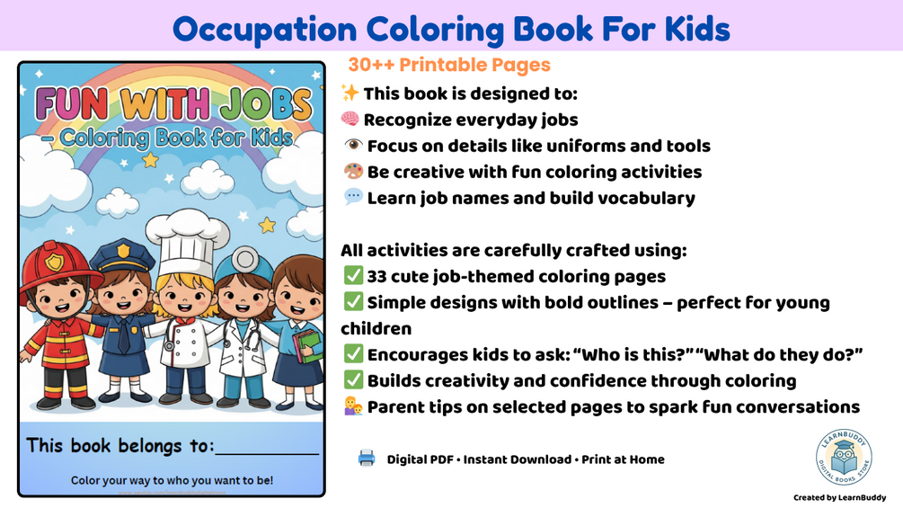 Perfect for toddlers and preschoolers, this PDF includes 30 unique occupation-themed pages plus 3 bonus free sample pages to enjoy.