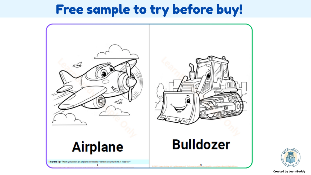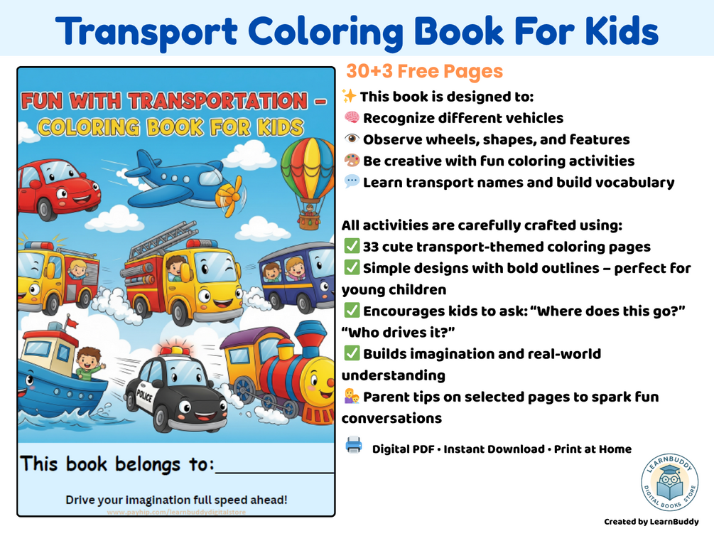 Perfect for toddlers and preschoolers, this PDF includes 30 unique transport -themed pages plus 3 bonus free sample pages to enjoy.