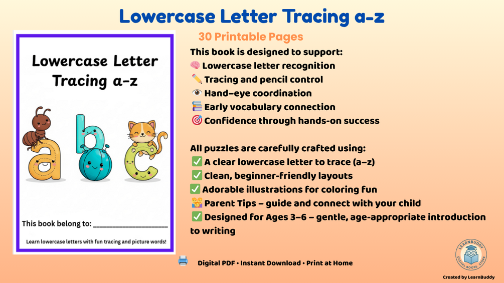 100% FREE 30 pages - Help your child begin their handwriting journey with this lowercase alphabet tracing workbook — perfect for early learners aged 3 to 5! This easy-to-use tracing pack features large letters, clean layouts, and plenty of space for little hands to trace and practice. Designed to build writing confidence, fine motor skills, and letter recognition in a fun, screen-free way. Ideal for preschool, homeschool, or quiet time learning at home!