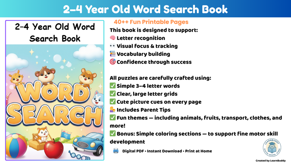 Help your little one explore letters and words with this toddler-friendly Word Search activity book! Designed specifically for ages 2β4, these simple and fun worksheets feature easy-to-recognize words, large letters, and cute illustrations to color β making early learning a joyful and creative experience. Perfect for introducing letters, boosting focus, and having fun with coloring!