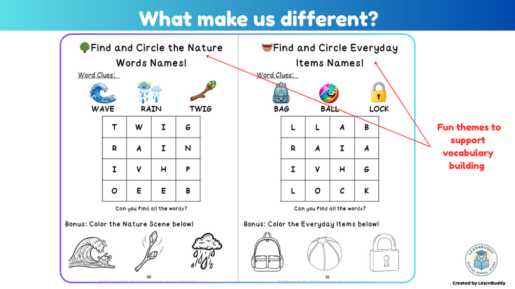 β Fun and familiar themes (animals, fruit, vegetables, transport, nature scene, daily items, etc.)