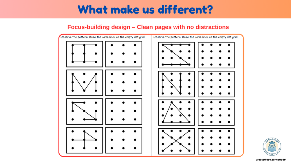 โ Includes dot-to-dot, matching, pattern completion, โspot the same,โ and line-drawing symmetry tasks