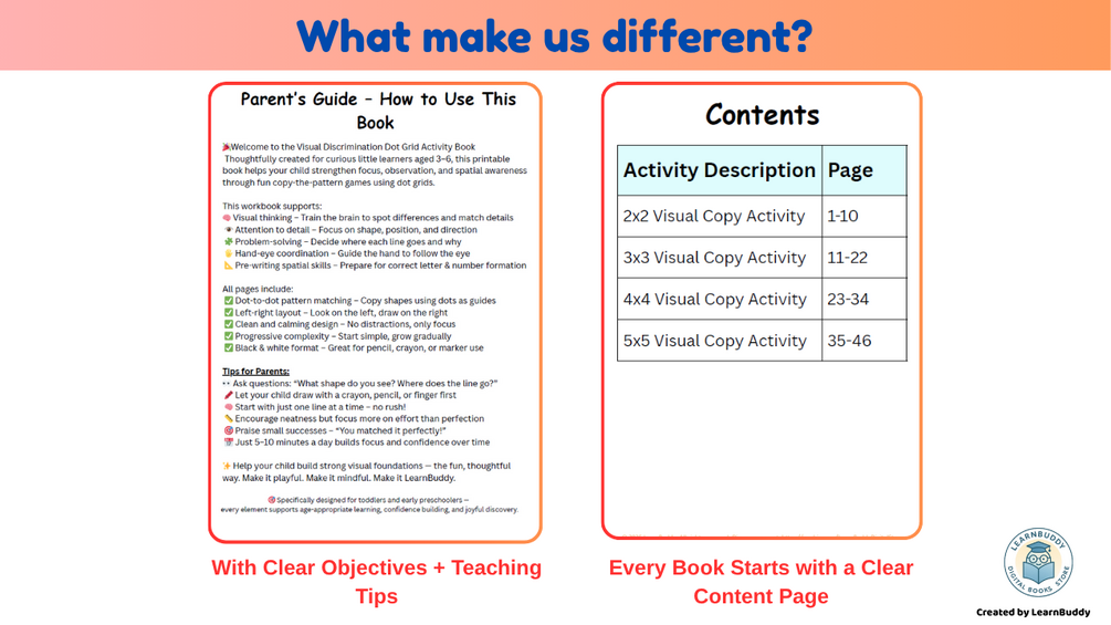 Help your child strengthen their observation skills with this Visual Discrimination Learning Pack โ a fun and educational way to build focus, attention to detail, and early logic skills!