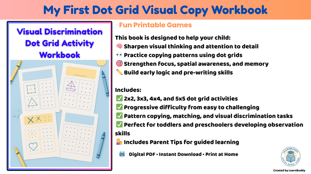 Help your child strengthen their observation skills with this Visual Discrimination Learning Pack โ a fun and educational way to build focus, attention to detail, and early logic skills! Designed for toddlers and preschoolers, these printable worksheets offer engaging activities like shape matching, shadow matching, visual patterns, and mirror images โ all with cute and kid-friendly illustrations.